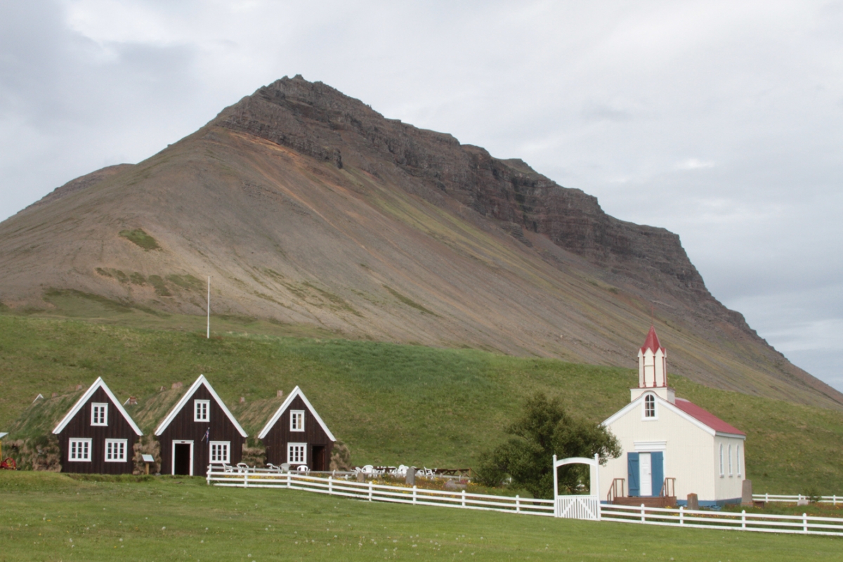 Burstabærinn (1997) og kirkjan á Hrafnseyri (vígð 1886). JL