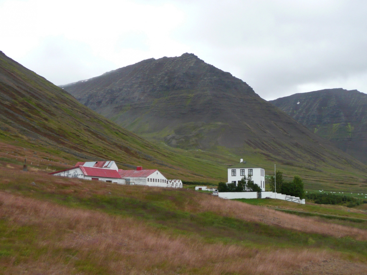 Hrafnseyri, húsakostur og útsýni yfir Arnarfjörð. JL